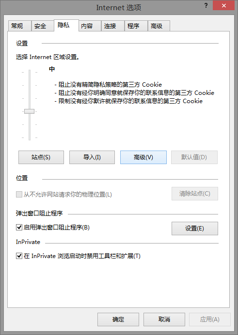 更改隱私設(shè)置。打開Internet選項(xiàng)窗口,切換到“隱私”面板,對隱私進(jìn)行高級設(shè)置: