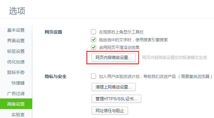 更改隱私設(shè)置。選擇“高級設(shè)置”,并點(diǎn)擊網(wǎng)頁設(shè)置中的“網(wǎng)頁內(nèi)容高級設(shè)置”: