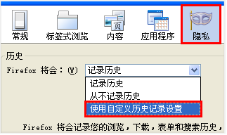 更改隱私設(shè)置。打開選項(xiàng)窗口,切換到“隱私”面板,在歷史選項(xiàng)下拉框中選擇“使用自定義歷史記錄設(shè)置”: