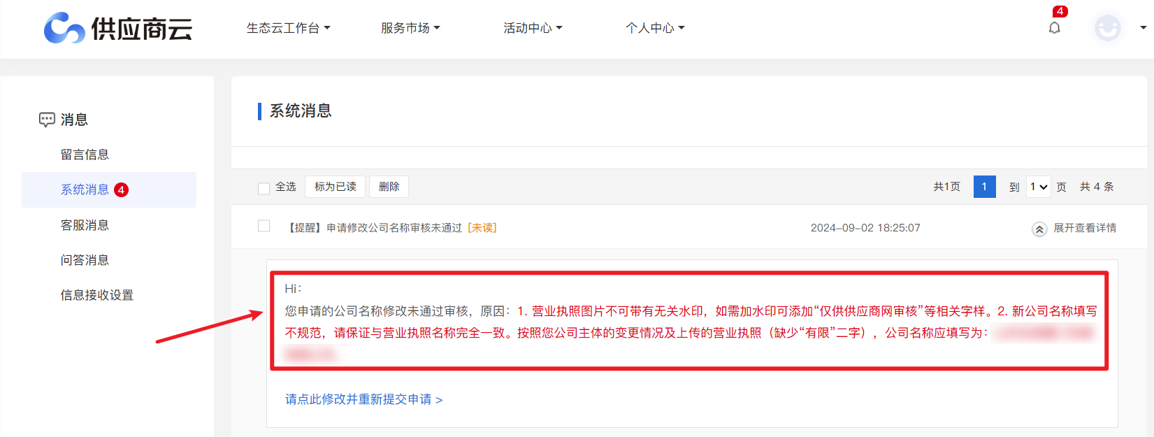 如果您申請(qǐng)修改公司名稱(chēng)被拒絕,我們將通過(guò)系統(tǒng)消息提示您具體不通過(guò)的原因(如下圖所示),您可參照消息內(nèi)的具體說(shuō)明,修改后重新申請(qǐng)即可。