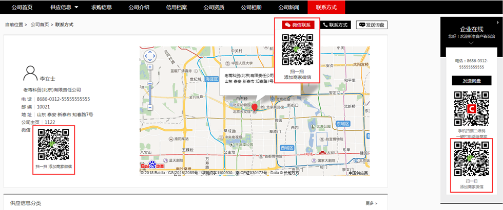 1. 商鋪頁面:商鋪頁面中的企業(yè)在線、微信聯(lián)系、聯(lián)系方式中,直接出現(xiàn)您的上傳的微信二維碼,掃一掃就能添加好友。