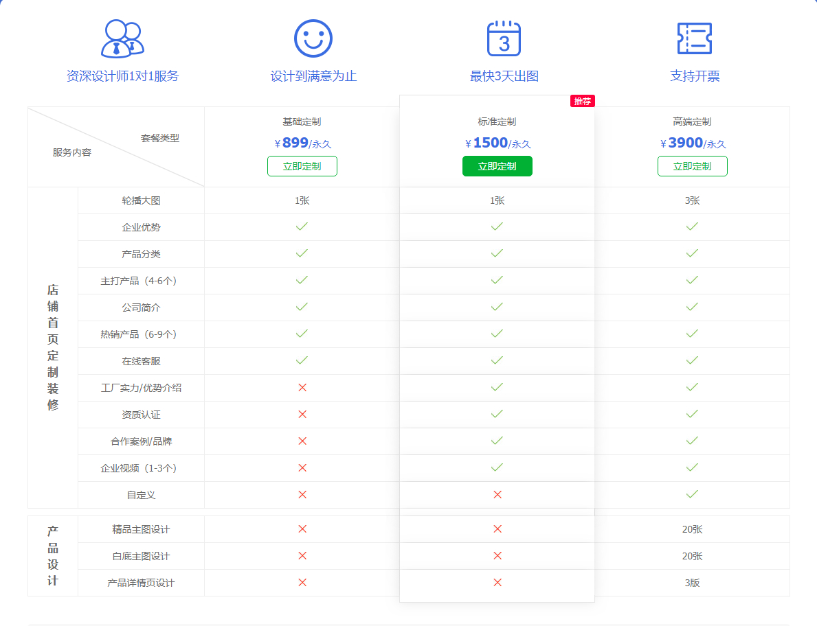 →基礎(chǔ)定制、標(biāo)準(zhǔn)定制、高端定制三種套餐有什么不同??jī)r(jià)格低的服務(wù)質(zhì)量會(huì)不如價(jià)格高的嗎?